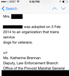 Ms. Brennan wrote that the adoptive group was “an organization that trains service dogs.” Who told Ms. Brennan this obvious lie? A simple Google search of Soliden would reveal no link between a service dog supplier and Soliden’s core business, “Security Systems Services.” But, either Vargus or Squires signed the adoption forms, despite the fact that the current law governing the free adoption of MWDs, Title 10 USC § 2583, stated the following: